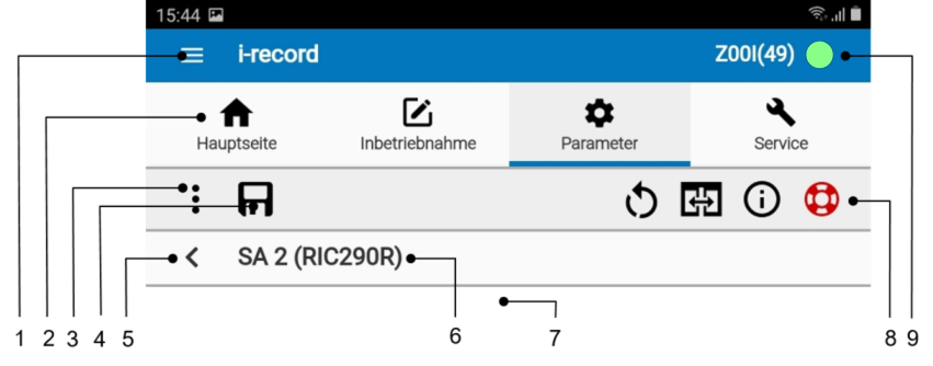 Im hellgrauen Balken erscheinen kontextspezifisch Icons, mit welchen Funktionen ausgeführt werden können. So erscheint zum Beispiel unter Parameter ein Speichericon.