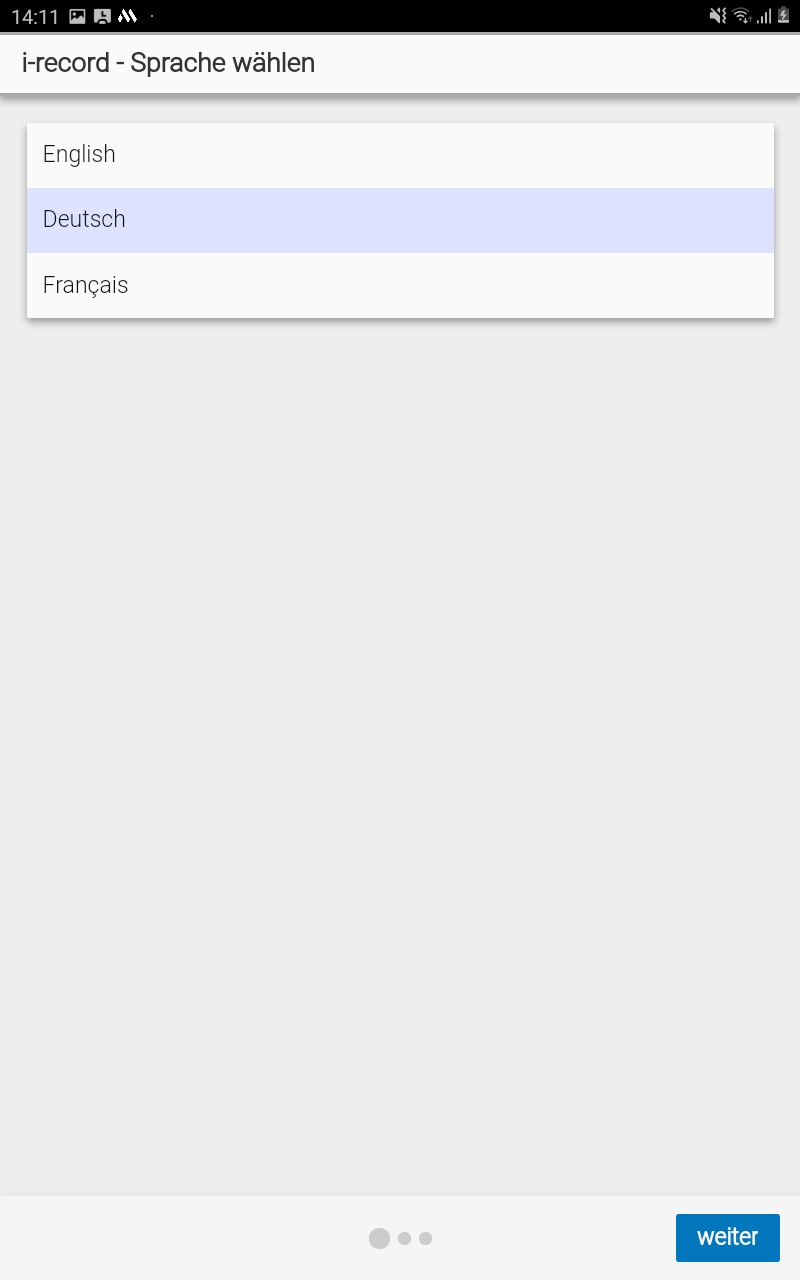 Als Erstes muss die gewünschte Sprache ausgewählt werden. Zur Verfügung stehen Deutsch, Englisch und Französisch.