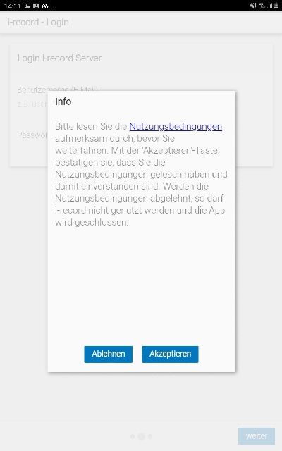 Beim ersten Starten der i-record App wird der Benutzer automatisch durch eine Erstanmeldung geführt, bei der die Applikation initialisiert wird. Hierzu ist unter dem folgenden Link ist ein Video zu finden, dass den Download und die Installation der i-record App über den Google Play Store, sowie die Erstanmeldung zeigt.