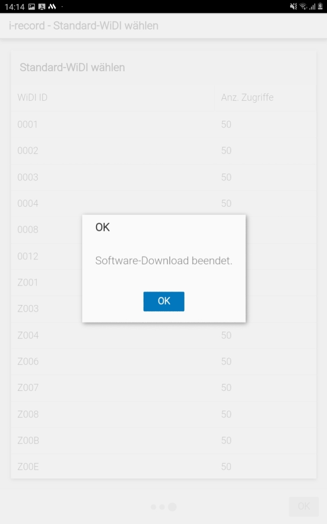 Bestätigen Sie die Auswahl mit der Taste "OK". Die Erstanmeldung ist hiermit abgeschlossen und die App betriebsbereit. Der Benutzer kann sich nun mit seinem WiDI verbinden und Türen konfigurieren.