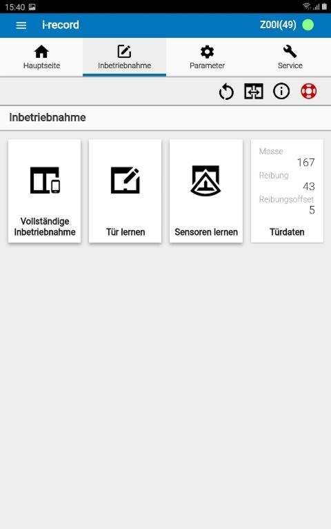 Unter Inbetriebnahme kann man zwischen einer vollständigen Inbetriebnahme (Tür- und Sensor-Lernen), einem Tür-Lernen und einer Sensor-Konfiguration auswählen.