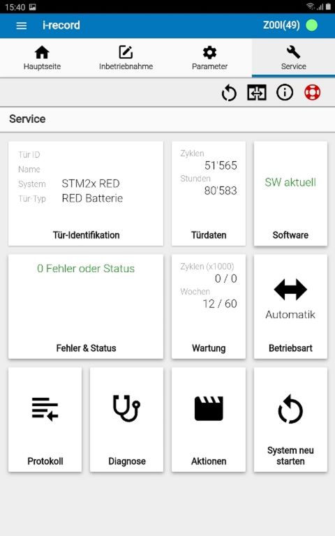 Eine wichtige Bedeutung für den Techniker hat der Service-Bereich. Hier hat er auf alle, für den Service und die Wartung erforderlichen Informationen und Funktionen Zugriff. Hier sind u.a. die Tür-Daten, der Zustand der Software, die aktuellen Fehler, die Zähler der Wartung und die Betriebsart zu sehen. Zudem können mit wieigen Klicks die Software aktualisiert, das Protokoll ausgelesen, die Eingänge angezeigt (Diagnose) und verschiedene, weitere Funktionen ausgeführt werden.