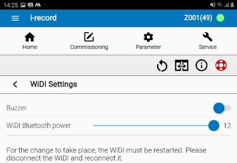 The WiDI settings are located in the general settings, which can be opened via the hamburger menu. The two values "Buzzer" and "WiDI Bluetooth Performance" can only be read and changed if the app is connected to a WiDI.