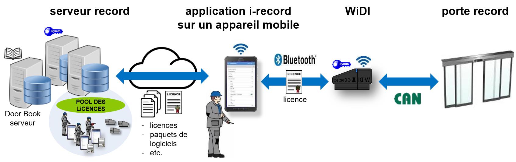 i-record est la solution innovante pour la configuration des portes record. À l’aide d’un Dongle, qui a pour nom WiDI (Wireless Door Interface), lequel est relié à la porte de manière filaire, le technicien autorisé peut se connecter à la porte tout simplement via Bluetooth®, en utilisant l’application Android i-record. En peu de clic, les portes peuvent être mises en service, paramétrées, configurées, ainsi que les capteurs, il est possible également de faire les mises à jour des logiciels, d’effectuer une analyse des erreurs et de les résoudre.